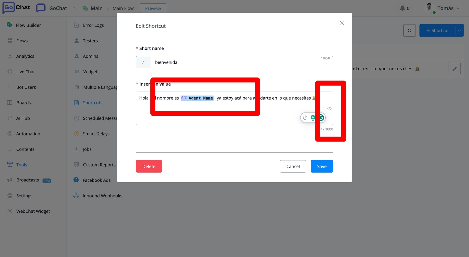 Shortcuts help agents make quicker responses to the user's query. You can also manage your shortcuts in Tools - Shortcuts.